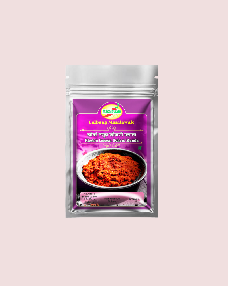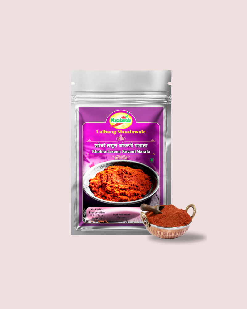 Lalbaug Masalawale’s Khobra Lasan Kokani Masala is an aromatic blend of dry coconut, garlic, and hand-roasted spices — inspired by traditional Konkan recipes from Maharashtra’s coastal belt.